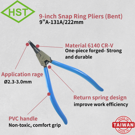 A-131A complies with European standard design, offering return spring and it’s one-piece forging, strong and durable. New Wealth company has the full series of circlip pliers in bent and straight head, it can easily enter narrow holes and improve work efficiency. It’s suitable for internal structures such as bearing seats and mechanical equipment. Suitable for automobile maintenance and equipment installation.