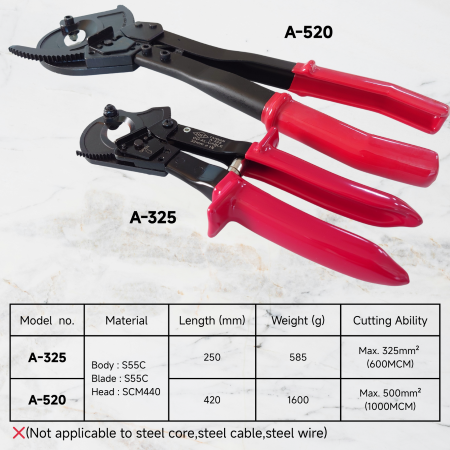 A-520 is made of CR-MO(SCM440) alloy steel, featuring a sharp and durable blade. When cutting with New Wealth forged blades, the cut surface can be smooth, preventing the cable deforming or splitting. Furthermore, the ratchet mechanism and extended handle design make cutting easier and effort-saving.