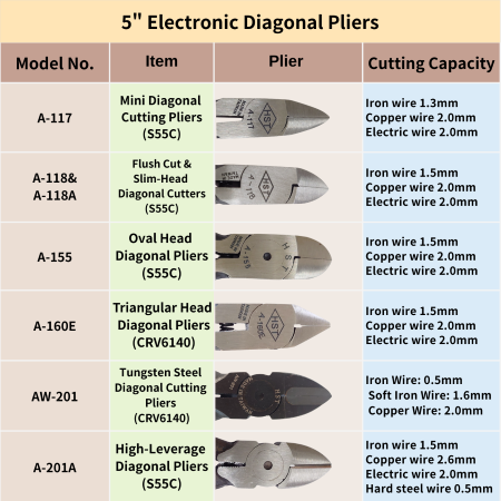 ◎ Full series of 5-inch electronic diagonal cutting pliers: A-160,A-160A,A-160CC,A-160E,A-117,A-118,A-118A,A-201A,A-160CRV,AW-201,AW-160
