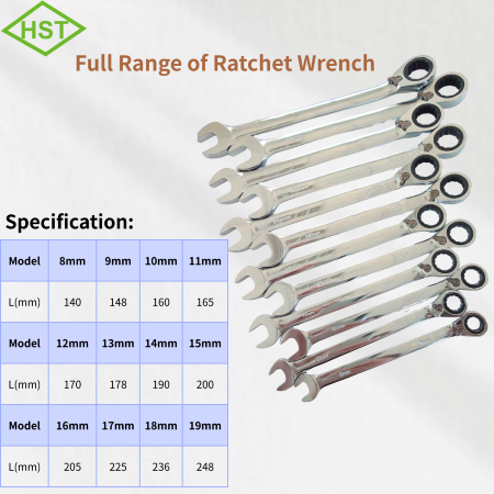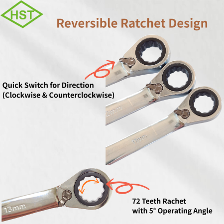Wrenches are tools for tightening or loosening bolts and nuts. HST Ratchet Wrench features a reversible design that allows for dual-sided operation with quick switch for direction clockwise and counterclockwise.