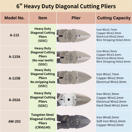 ◎ Full series of 6-inch heavy duty diagonal cutting pliers : A-202A、A-115、A-115A、AW-202